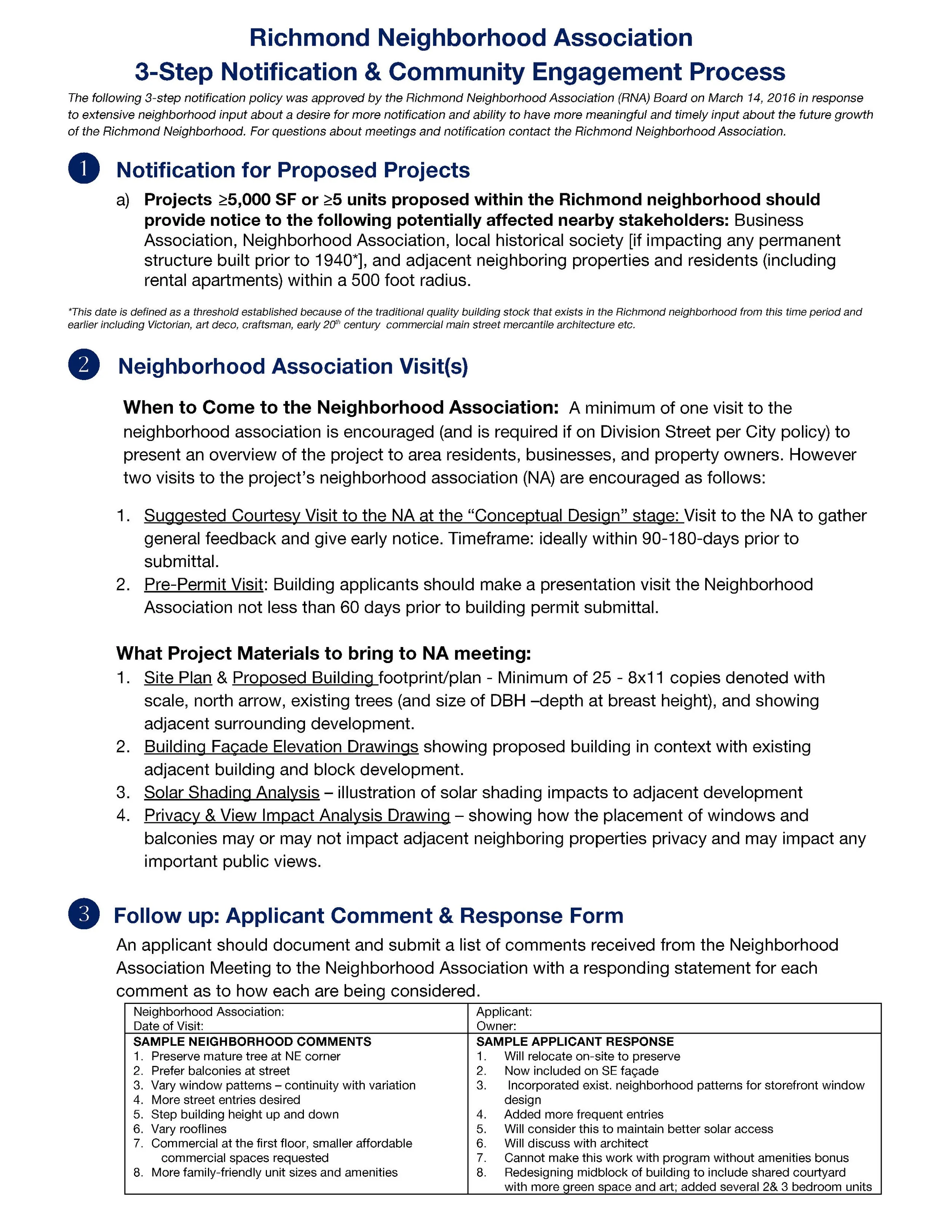 Developer Notification & Community Engagement Policy | Developed by the Richmond Neighborhood Association (RNA) and adopted by RNA, HAND, and STNA. This gives guidance on when to engage, what information to bring (e.g. context elevation) so community groups can understand context and impacts, and has a template for how to follow-up on community comments heard.